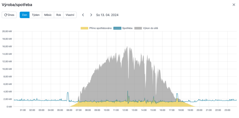 Pro modelový příklad jsem vybral zákazníka, který má instalovaný výkon FVE 20 kWp a přes víkendové dny i poměrně stabilní spotřebu objektu v čase okolo 1,6 kWh. Je tedy možné se získanými daty přehledně a názorně pracovat.