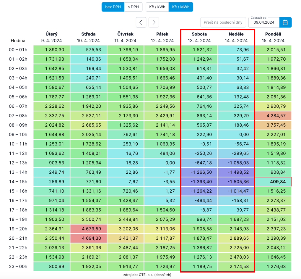 Poslední víkendové dny (13.–14. 4. 2024) byly, co se týká spotových cen, hodně zajímavé. Ceny v určité hodiny klesaly hluboko pod 1 000 Kč/MWh (viz obrázek s cenami níže) nebo přehledně na webových stránkách.