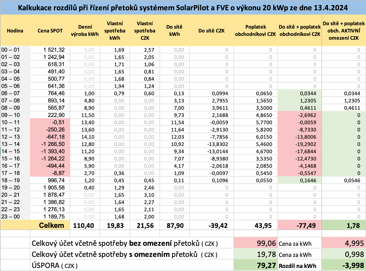 V případě, kdy jsem neměl vypnuté přetoky, jsem za celodenní výrobu (13. 4. 2024) zaplatil 77,49 Kč.