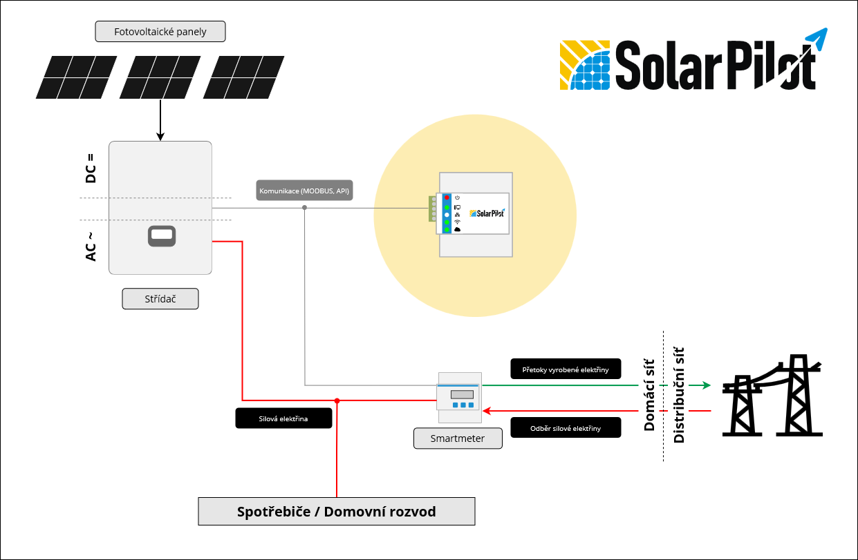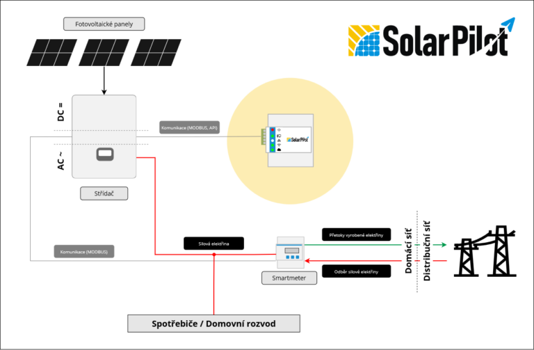 Elektroměr (smartmeter) je připojen prostřednictvím RS-485 k řídící jednotce SolarPilot, která čte informace o výrobě ze střídače a informace o spotřebě z instalovaného elektroměru.