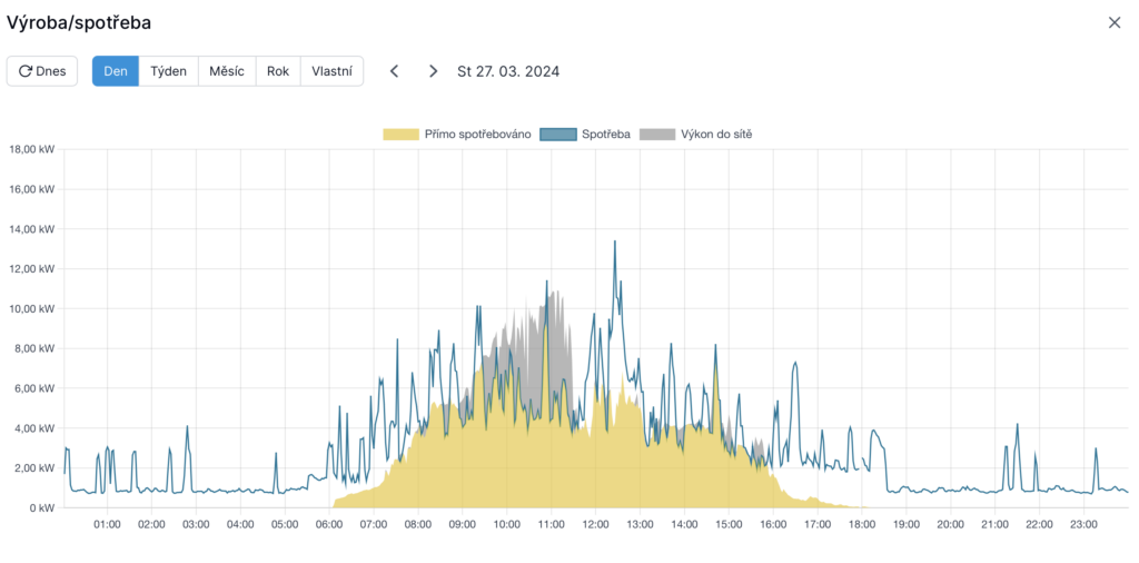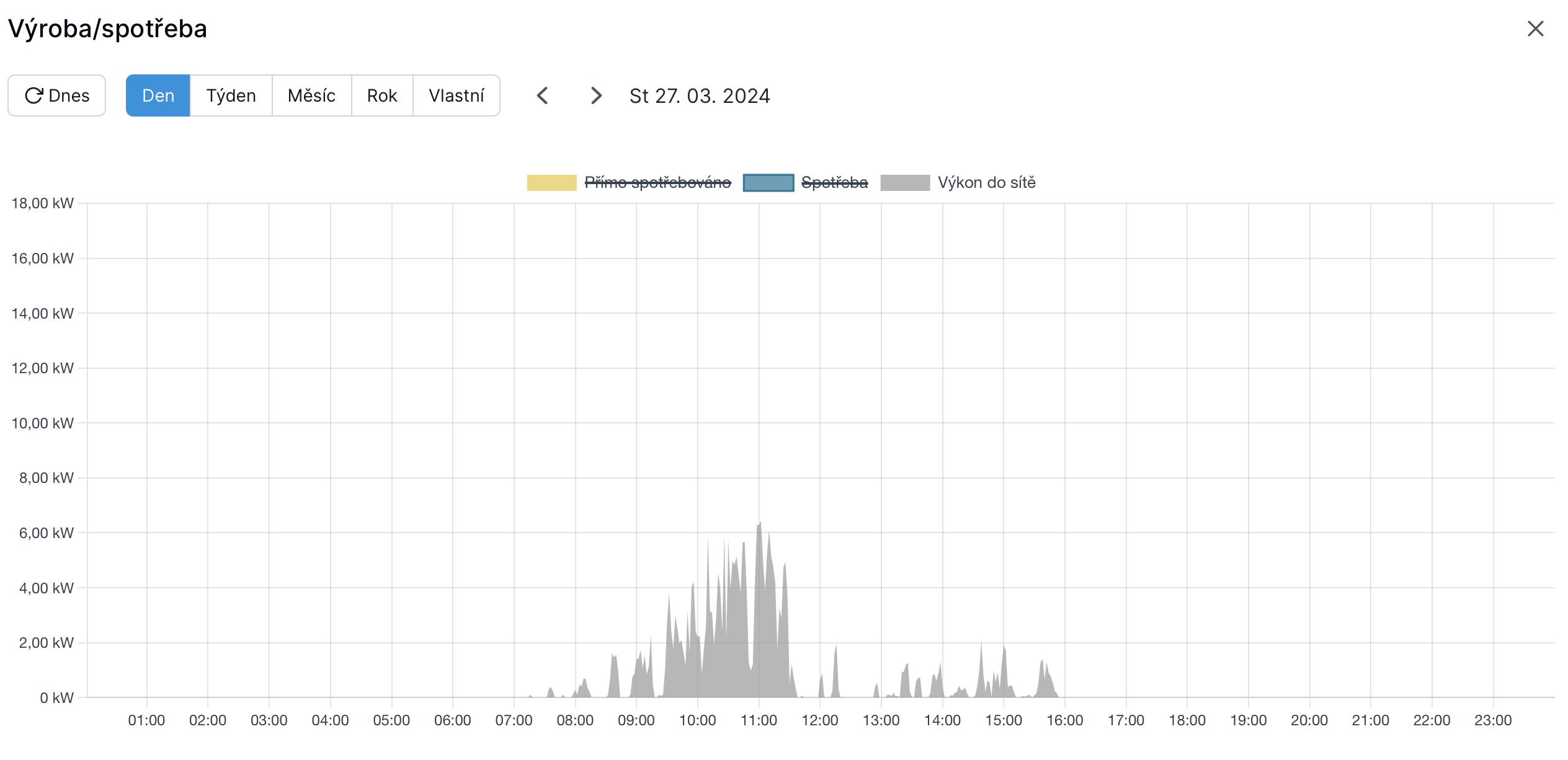 Pokud je smartmeter nainstalován, tak je již možné s daty pracovat. V grafu (viz obrázek výše) je vidět nejen výroba elektrárny (žlutá plocha), ale také spotřeba celého objektu (modrá křivka) a případné přetoky do distribuční sítě (šedá plocha).