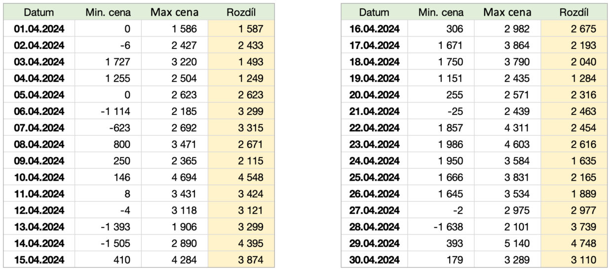 Rozdíl mezi minimální a maximální cenou na spotovém denním trhu s elektřinou