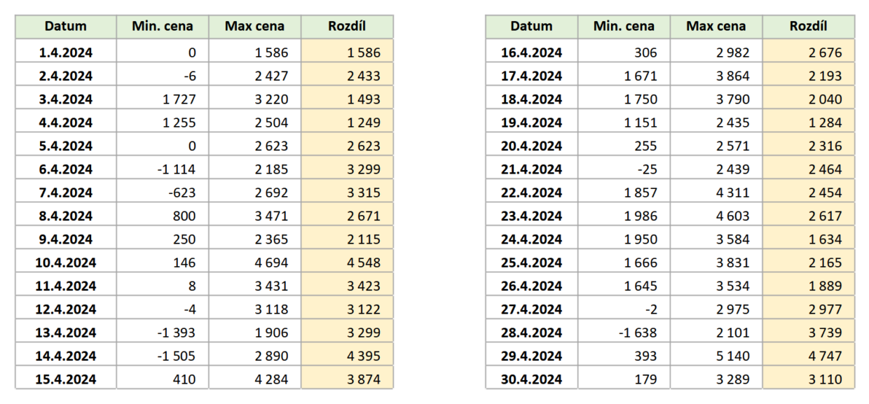 Rozdíl mezi minimální a maximální cenou na spotovém denním trhu s elektřinou (cena bez DPH za MWh)