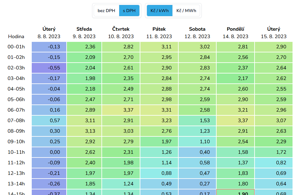 SolarPilot – tabulka spotových cen.