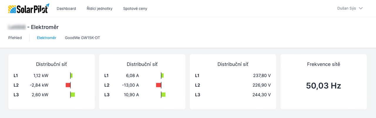 Na dvou fázích probíhá v tento moment prodej 3,72 kW (součet), dost často za nízkou výkupní cenu a na jedné fázi probíhá nákup 2,84 kW, který je zpoplatněn cenou za energii + distribuci, která často, dle dané ceny na spotovém denním trhu, tvoří značnou část ceny odebrané elektrické energie.